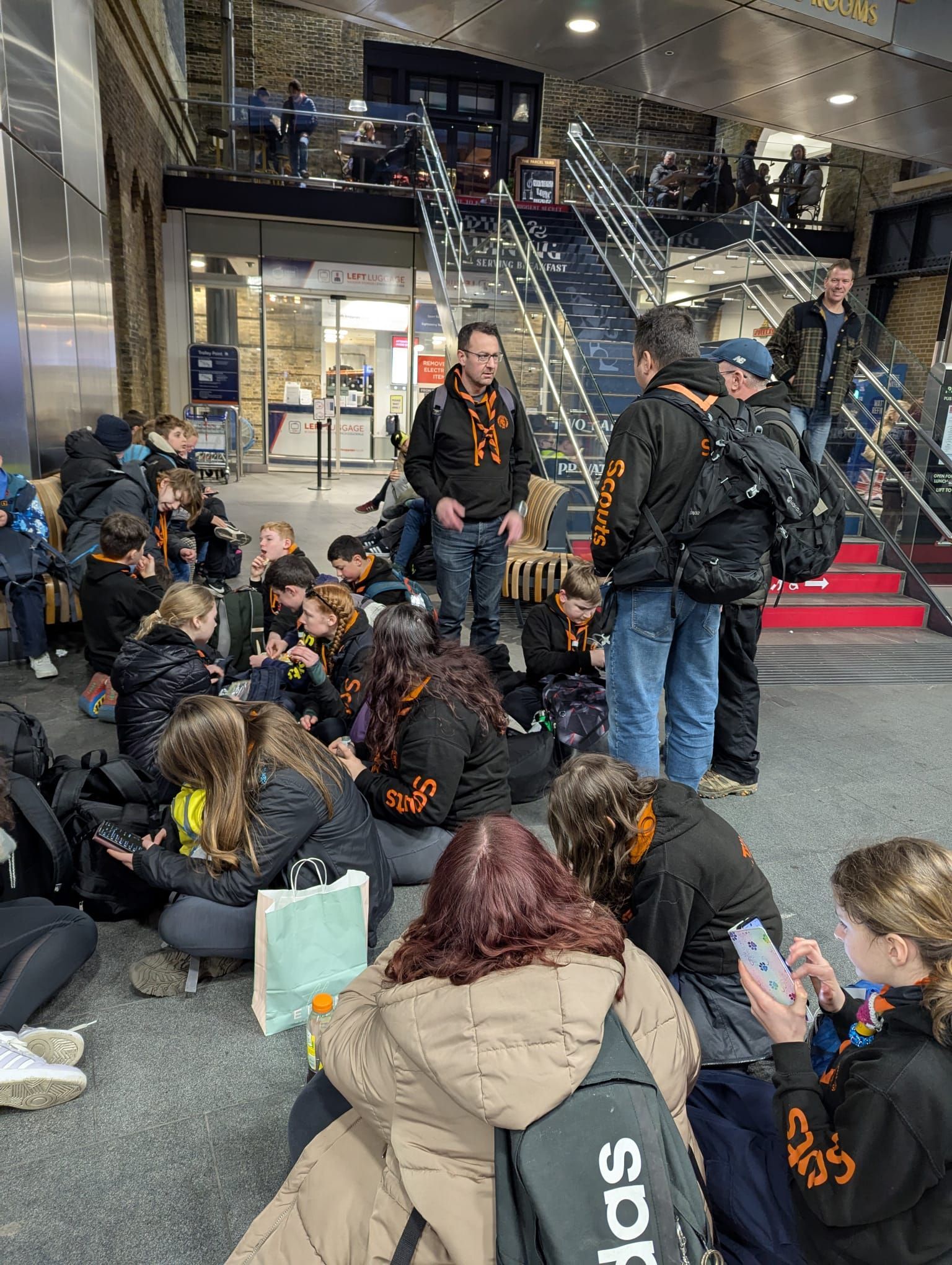 So, as 18:00 came around, the teams all arrived at Kings Cross. Weary Scouts and Explorers took over a space and rested their weary legs waiting for the train platform to be announced.