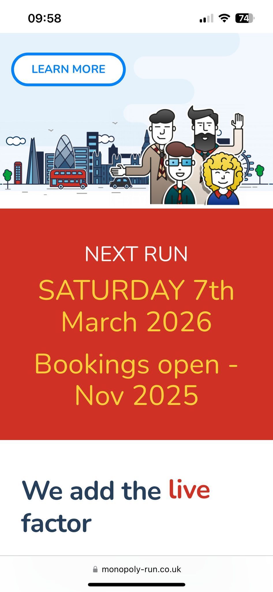 Billed as “a real-time version of the popular Monopoly Run board game”, Monopoly Run Live is played on a single day in central London and involves visiting the actual sites that the board game is based on. There are multiple 'mini-games' run simultaneously, enabling hundreds of teams to compete on the day, yet each team will only have a maximum of seven other competitor teams, giving everyone a good chance at winning. (https://monopoly-run.co.uk/)